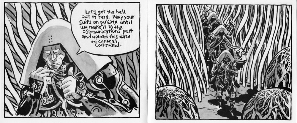I’m not going to waste too much time talking about the plot of the book — though it comes in at over 30 pages, this is just the barest beginning to the story, which seems to involve two warring groups and a coming massive conflict. But it’s worthwhile to point out that there is nothing explained whatsoever, no captions, no expository dialogue, Sam just kind of spreads out his story like a picnic blanket and you have to figure out where the food is.