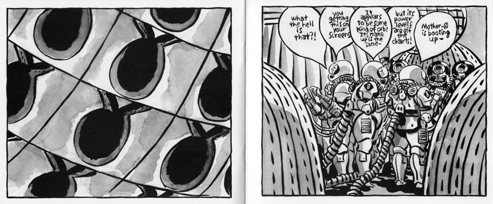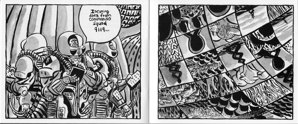 The mini is laid out in two page spreads like this, each page a single panel. Sam takes it a step farther and uses this spread layout to create numerous images which juxtapose against one another and create further abstractions. The spread above appears after a long sequence of images as we see a massive machine receiving the signals from commandoes on the outside. What is it? Is it alive? It’s powerfully reminiscent of the giant Neo-harvesting machines from The Matrix, but as we get closer we see that it’s a network of screens and computer stations, like a giant hivemind operated by little astronaut technicians. What is the image above? There’s little introduction to it, and no explanation. Are we looking at multiple images (upside-down!) on a insect-like compound eye? The following spread does nothing to explain it either: