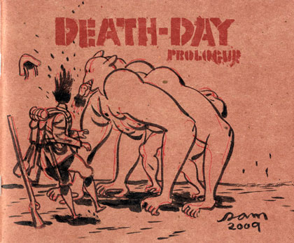 I’ve been meaning to say something about this comic for a couple of months–I ordered a bunch for the store right after HeroesCon, I knew they’d be gone before too long and wanted to stock up. The Death Day mini is a preview of hot-snot artist Sam Hiti‘s next big book, which I believe will also be called “Death Day.” WEIRD. You might, if you’re lucky, be familiar with Sam’s work from his awesome Tiempos Finales (“End Times”), or his several minis or Ghoulash series of sketchbook/strip collections. If I were going to pick my five favorite cartoonists working today, his name would certainly be on that list, he’s just got something special going on. So, a fair and balanced review of Death Day this will not be. I also encourage you to click on these images, each of which is a two-page spread from the mini, and each will look more awesome all big.